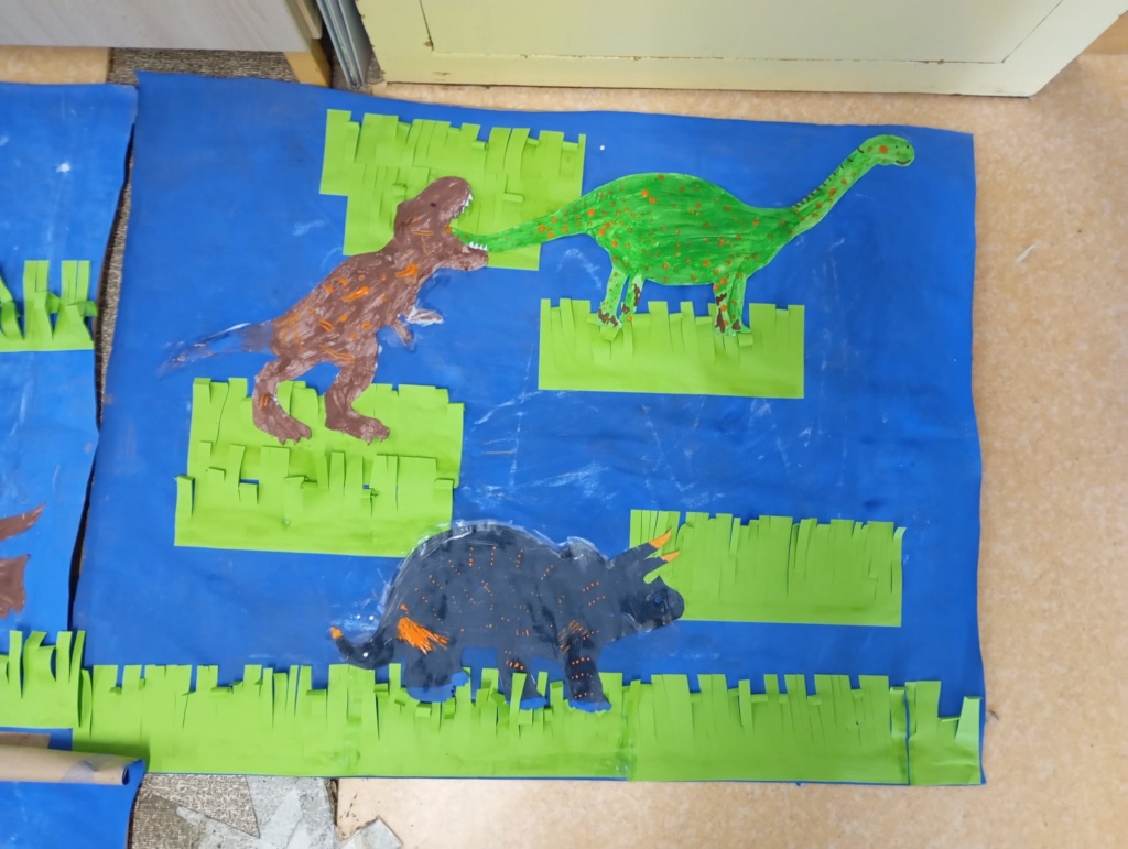 Mardi 27 janvier, de la Petite Section au CM2, tous les élèves de l'école étaient mélangés pour réaliser des productions artistiques sur une période de l'histoire, thème de l'année : le temps des dinosaures, la Préhistoire, l'Antiquité, le Moyen-Âge, les Temps Modernes et l'Epoque Contemporaine.